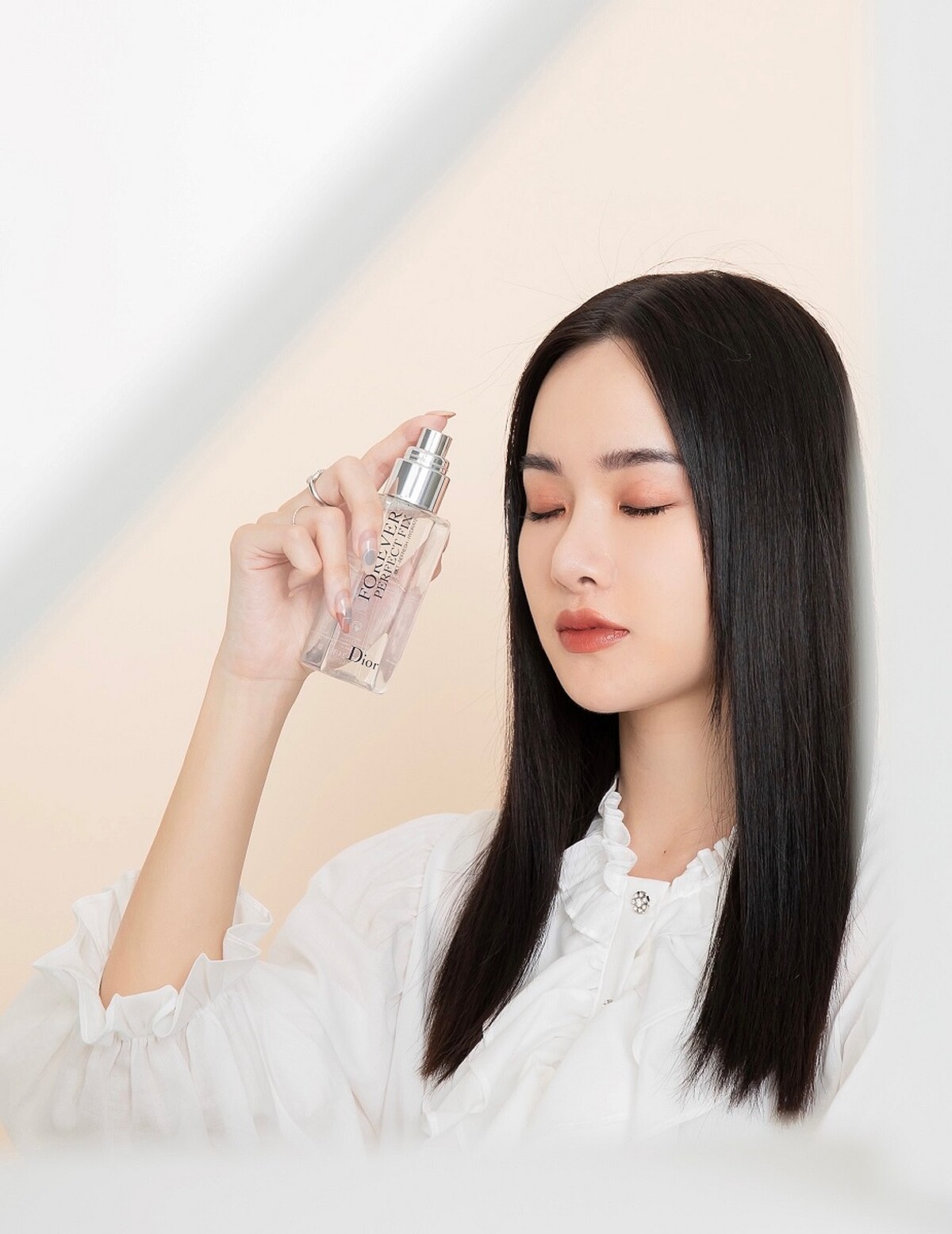 Step 3. 保濕服貼:底妝完成後,先噴一層Dior超完美持久定妝噴霧,細緻水霧能讓粉底更服貼透亮!噴灑瞬間散發的高級香氣,也讓人心情一振。