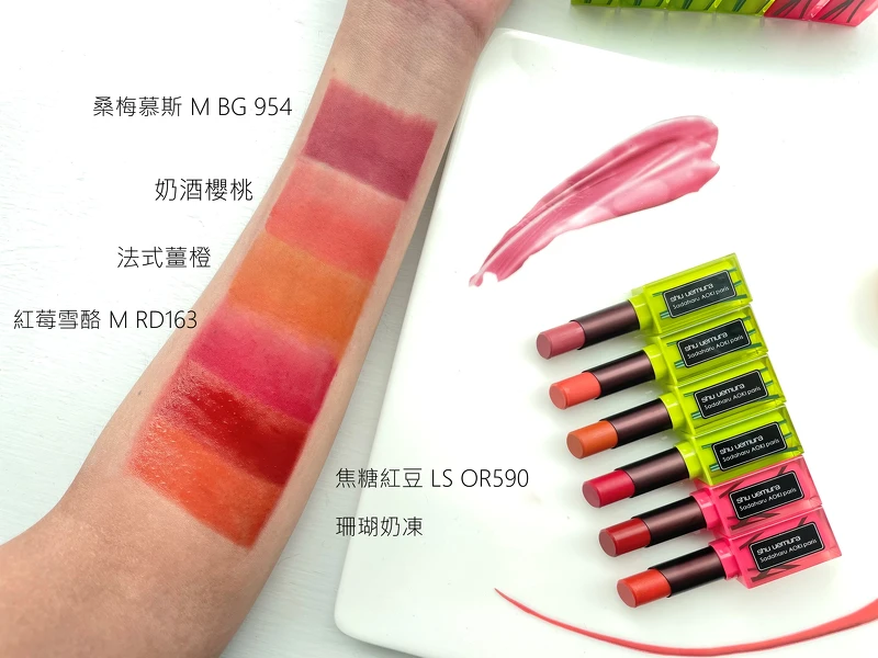限量系列中共有6款無色限唇膏,包含4色抹茶色管身的粉霧保濕唇膏,以及2色粉豆色管身的聚光豐潤唇膏。其中有3款全新色包括:奶酒櫻桃、法式薑橙、珊瑚奶凍;3款常態熱賣色換上新包裝:紅莓雪酪、桑梅木絲、焦糖紅豆。