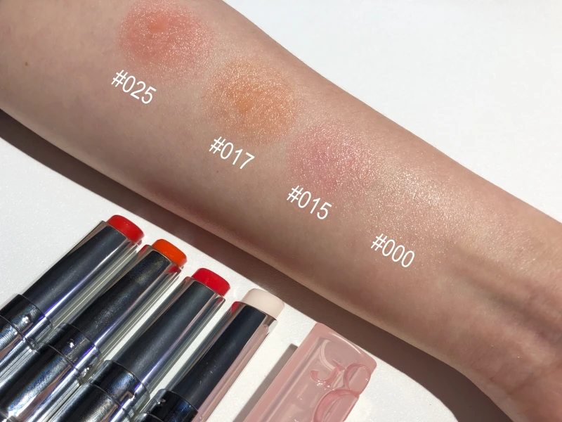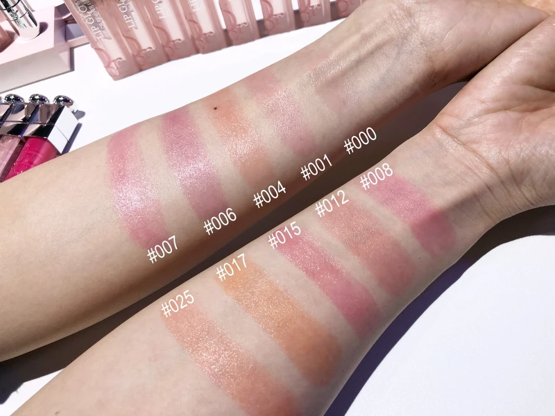 迪奧癮誘粉漾潤唇膏2021年一口氣增加到10色,其中有最經典的#001嬰兒粉、活潑俏麗的#004蜜桃橘、最顯白的#006莓果粉、低調柔美的#012玫瑰木。新增加的四色則是:#000晶漾透明、#015櫻桃紅、#017珊瑚橘、#025首爾紅。
