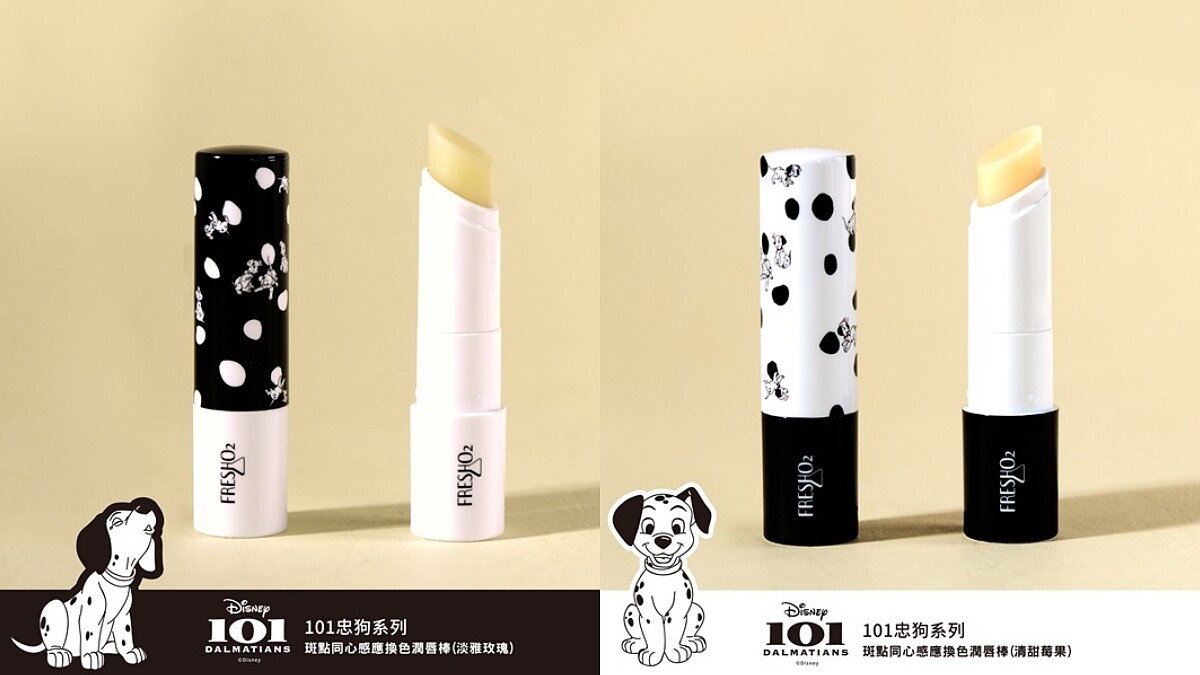 FreshO2 2021年推出迪士尼授權101忠狗彩妝,以大麥町黑白斑點為靈感的「斑點同心系列」讓兩款經典商品換上限定包裝,包括斑點同心感應換色潤唇棒雙入組、斑點同心柔焦控油蜜粉餅,超可愛設計絕對是不可或缺的收藏商品。