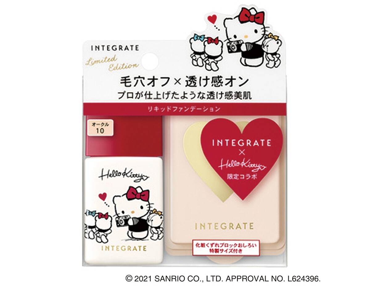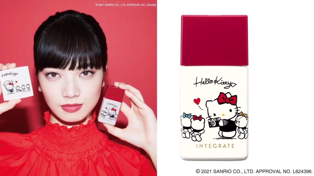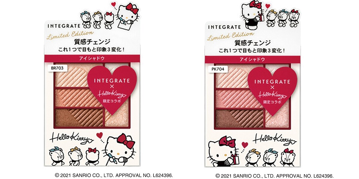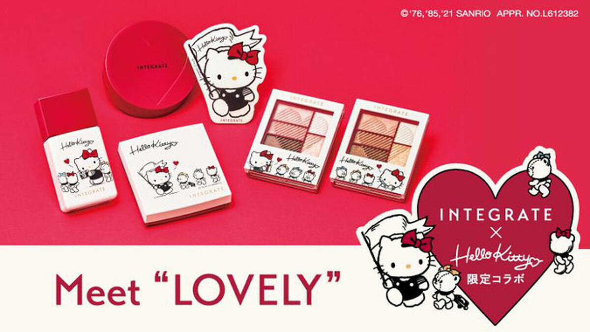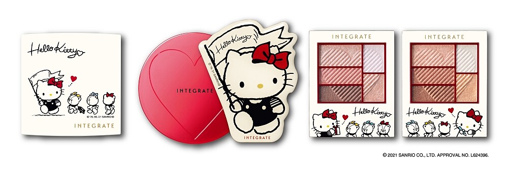 INTEGRATE櫻特芮2021年與Hello Kitty合作推出「Meet LOVELY」聯名彩妝, 敘述Kitty遇見INTEGRATE後進入的可愛世界。包裝設計以米白色為主軸,畫上帶有復古感的KITTY及泰迪小熊Tiny chum,看起來既有童趣又富有質感,絕對可以整套收藏。