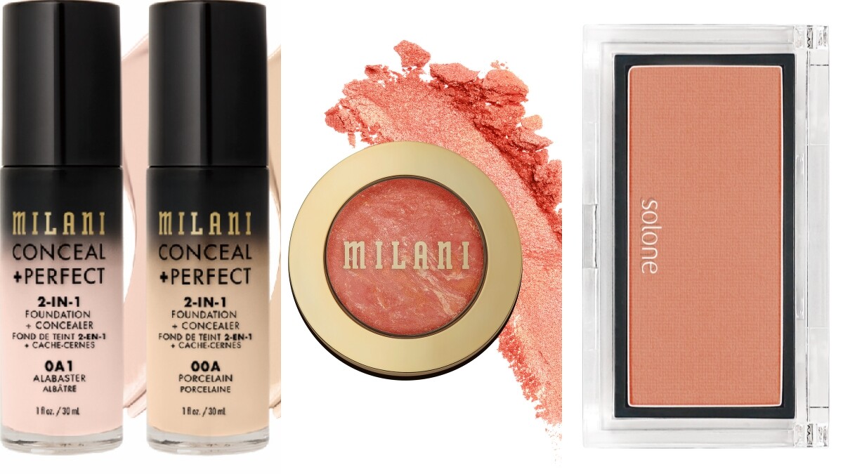 開架彩妝推薦商品:Milani完美零暇二合一遮瑕粉底液、Milani經典烘焙腮紅 #08 Corallina、Solone蘋果肌紅潤腮紅