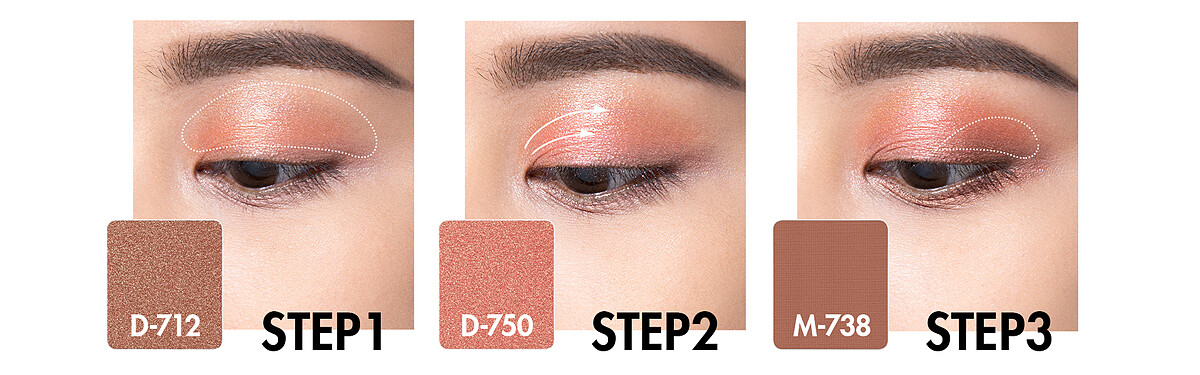 STEP 2:使用帶著暖橘珠光的D-750,從眼頭暈染至眼尾,唯美漸層讓眼神又仙又溫柔。