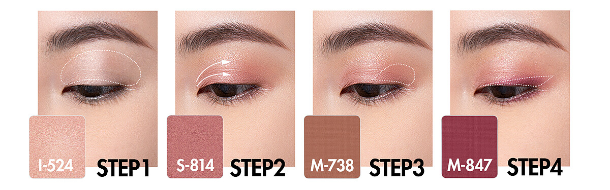 STEP 2:接著使用主色調S-814從眼頭暈染至眼尾,薄暮粉紅讓眼神顯得更溫柔、充滿女人味!細緻又高級的光澤,呈現絲緞般的質感,完全不會有泡泡眼問題。