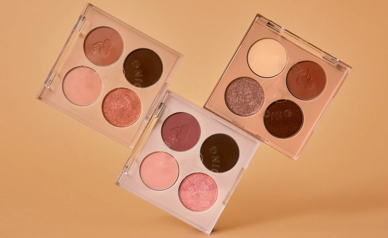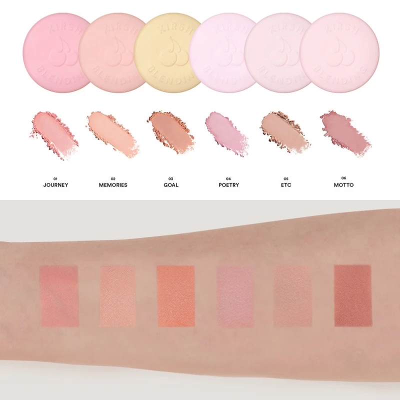壓印上經典的KIRSH BLENDING櫻桃LOGO,每一盤眼影盤都含有霧面色與亮片色,色調由深到淺,讓每一格超實用零廢色。粉質好延展、不結塊,一盤就能完成迷人電眼。