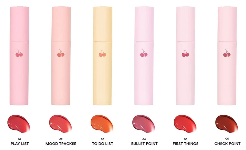 搭配腮紅一樣推出六色:01 PLAY LIST、02 MOOD TRACKER、03 TO DO LIST、04 BULLET POINT、05 FIRST THINGS、06 CHECK POINT,從粉色調至橘色調的唇彩色系一次擁有。