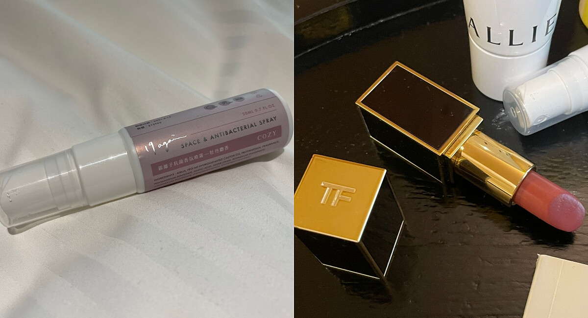 提到出門,Blaire跟我們分享他包裡一定會帶上小罐裝的銀離子抗菌噴霧,除了抗菌外更同時具有除臭的功能,那在妝容上會有所調整嗎?Blaire說,跟以往比起來,底妝的用量變得很省,若非拍攝需求,大多只上局部的遮瑕修飾疤痕和斑點,也會把遮瑕筆隨身攜帶使用,雖然露出整張臉的機會不多,還是會選擇一支百搭且素顏也能使用的唇彩放進包包,像是 Tom Ford 設計師唇膏的紅玉奶茶,是一支玫瑰棗紅色,有需要就能馬上補妝。