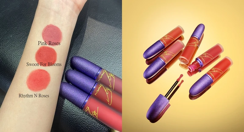 絲柔粉霧唇釉的蓋子也換上了紫色的金屬外殼及簽名LOGO,Rhythm N Roses、Swoon For Blooms以及Pink Roses是Lisa創作並命名的色號,Lisa透露他最喜歡的色號是Pink Roses煙燻玫瑰,低飽和的煙燻色調適合所有人,Rhythm N Roses是帶有甜美感的蜜桃鮮奶色,Swoon For Blooms則是編輯私心推薦的秋冬必收顯白楓紅色。另外3個經典色號想必大家也相當熟悉,分別為SORRY NOT SORRY 奶油南瓜、FASHION, SWEETIE 焦糖蘋果和HAUTE PANTS 紅絲絨奶霜。