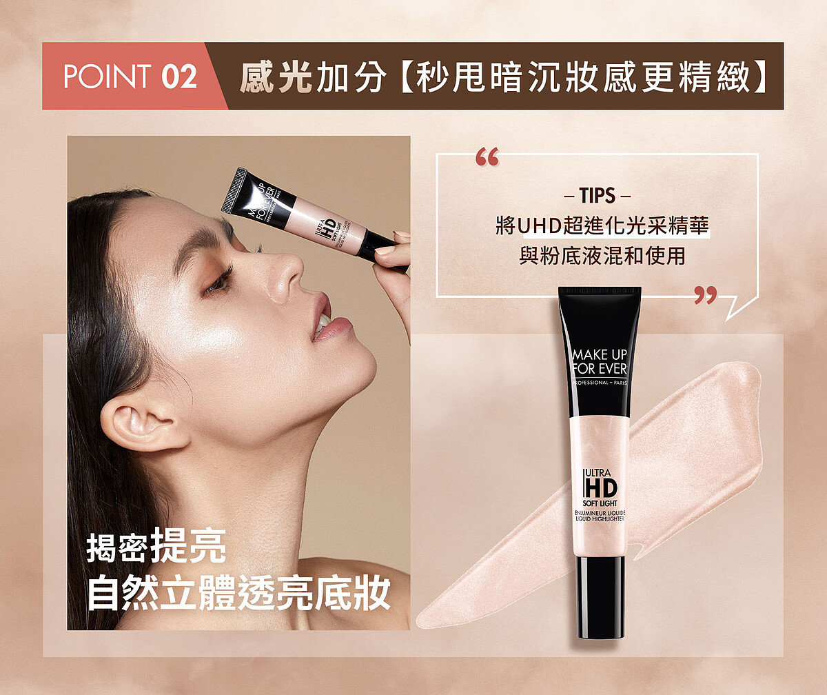 女生最在意的膚色暗沉,MAKE UP FOR EVER也有解!將超進化光采精華與粉底液混合後使用,細膩的珍珠貝殼柔光可以為全臉感光度再加分,液態打光質地含有能滋潤肌膚的保養成分維他命E,不但能帶來更透亮自然的光澤感,同時還能讓肌膚自帶水光,提升肌膚的水潤與保濕度,不太擅長局部打亮的化妝新手,M編大推一定要收它,混和在粉底中均勻塗抹在肌膚上,就能幫你自動感光,去除暗沉、提亮膚色、補強立體光!