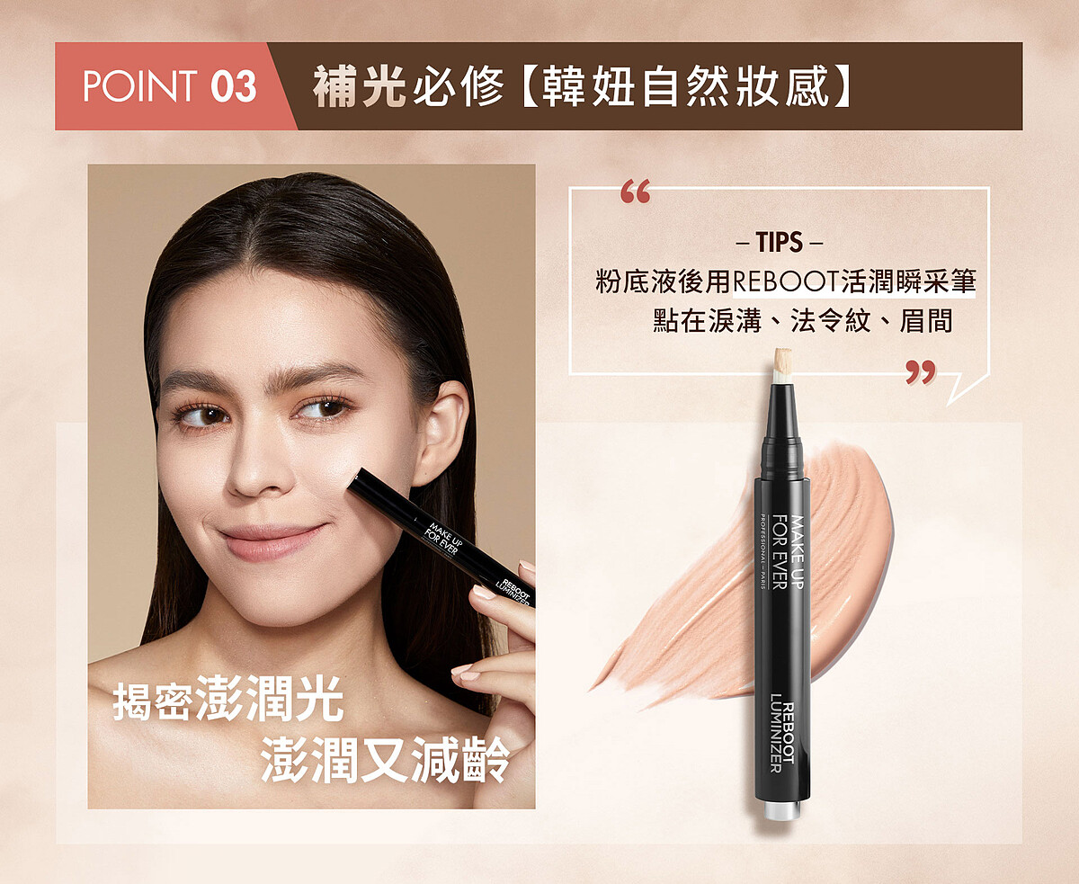 容易顯老的法令紋、淚溝、眉間皺紋,靠MAKE UP FOR EVER補光神器也能一秒神救援~只要在底妝的最後步驟,使用「REBOOT活潤瞬采筆」局部加強,方便順手的筆刷設計能即刻補光提亮,修修黑眼圈、法令等暗沉凹陷顯老處,尾端輕輕一按,柔軟筆刷就能自動補充用量好掌控,含蠶絲油、天然保濕因子透明質酸的打亮質地,針對眼下細紋、唇周能有更優秀服貼的修飾度,讓顯老部位瞬間視覺效過變膨潤,整個人看起來馬上年輕5歲!