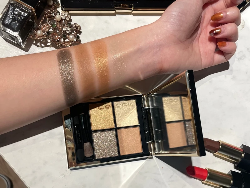 兩盤眼影展現出不同意向,108誘月是金黃色搭配細緻的棕色,表現出「映射窗外閃耀光芒模樣」,非常日常且實用百搭;109冬委則更具冬日氣息,運用古銅、藕紫和銀色亮片色展現冬夜的寧靜,能夠打造出更具個性的高冷妝效。