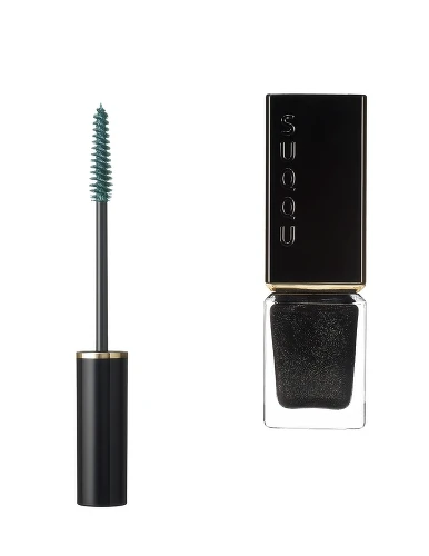 睫毛膏是莫蘭迪綠色的基底裡添加了細細的珠光,低調中又能讓眼神更明亮,冬日夜晚滴落的水珠模樣為意境,顏色是深黑色澤具清透感,細緻的珠光帶出輕盈的色彩效果。