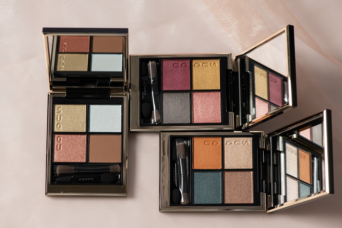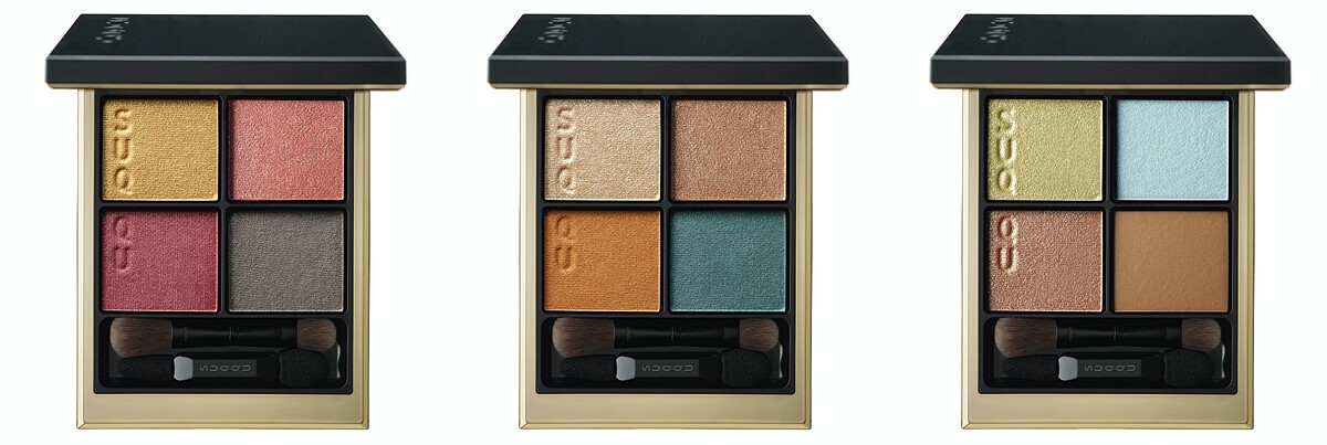 紅咲是具有亮澤感的粉色系,搭配明亮的燦金色和能收斂妝效的柔和灰色調,創造優雅的大人系妝容。風撫以明亮清新的橘色為主色選,搭配介於藍色和綠色之間的孔雀綠,再疊擦左上的光亮米色調,可於親切自然和個性派之中變換。限定色恣則是以高明度和透明感為主的眼盤,除了右下角的棕色外其他三色皆為透膚感的珠光色,能替春天的妝容增添立體光效。