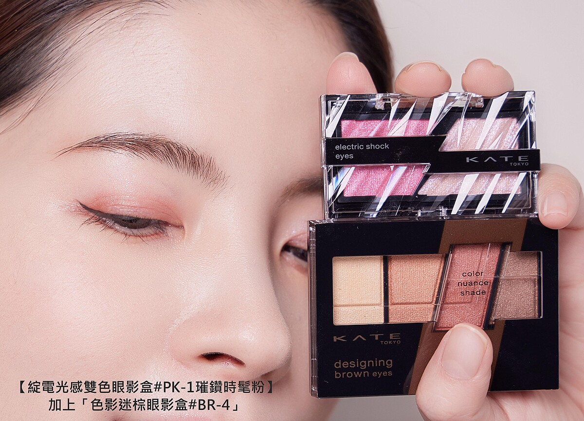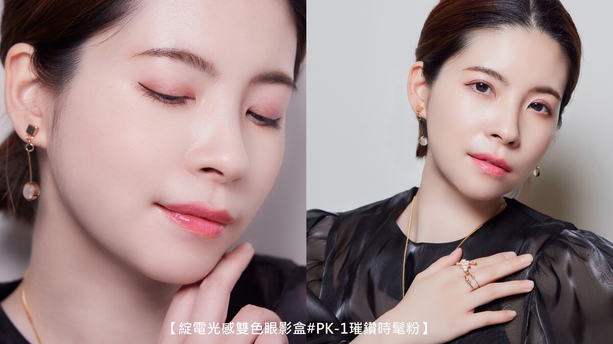 脫單&招桃花不能錯過!用【綻電光感雙色眼影盒#PK-1璀鑽時髦粉】加上「色影迷棕眼影盒#BR-4」,粉嫩水光粧感討喜又吸睛。