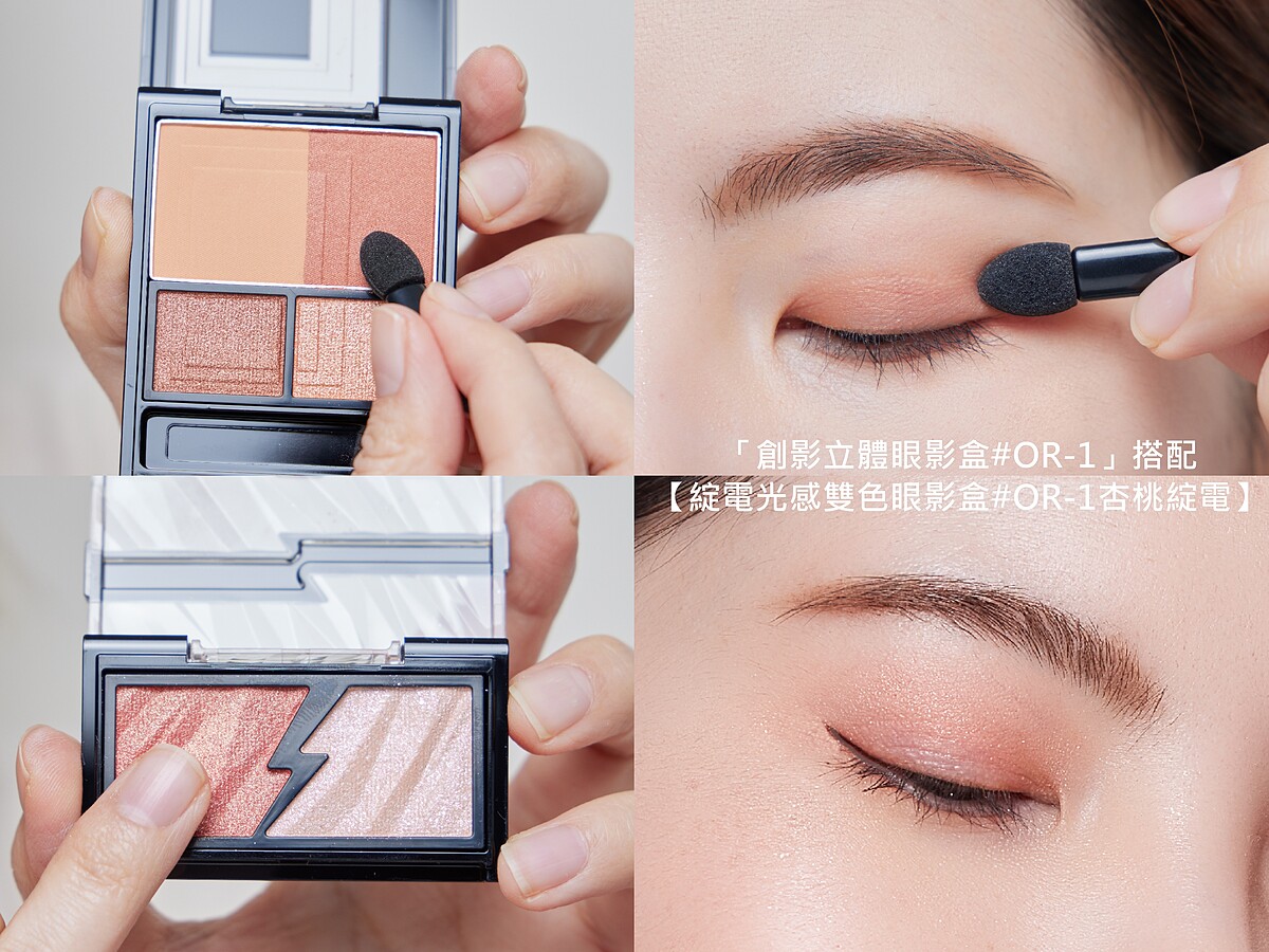 上班族必備氣質雙眸!用【綻電光感雙色眼影盒#OR-1杏桃綻電】搭配「創影立體眼影盒#OR-1」,優雅蜜桃色眼粧讓同事看到都稱讚~