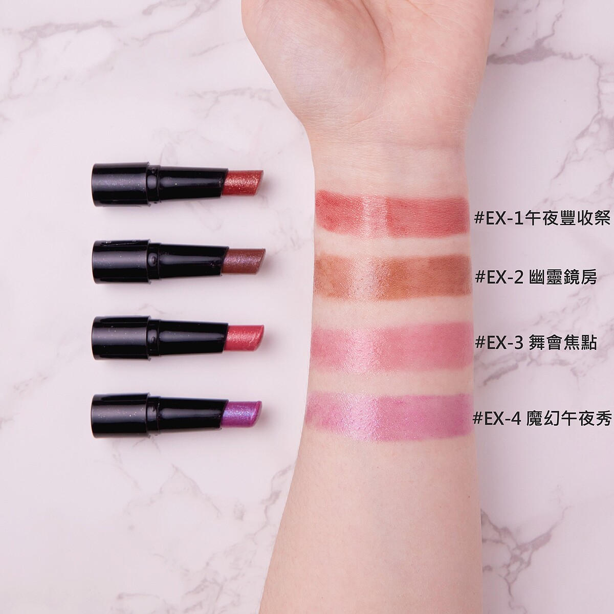 有四種珠光閃耀色選:嬌嫩橘紅色的#EX-1午夜豐收祭、珠光棕色的#EX-2幽靈鏡房、討喜亮粉色的#EX-3舞會焦點、耀眼紫粉的EX-4 魔幻午夜秀。
