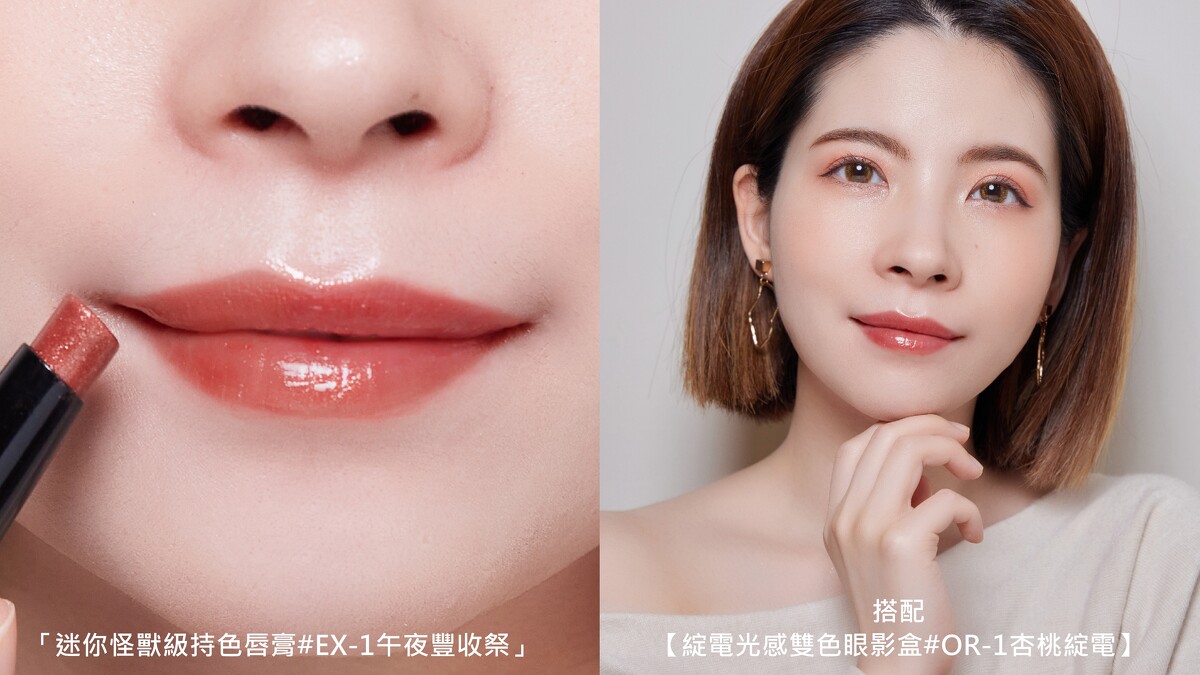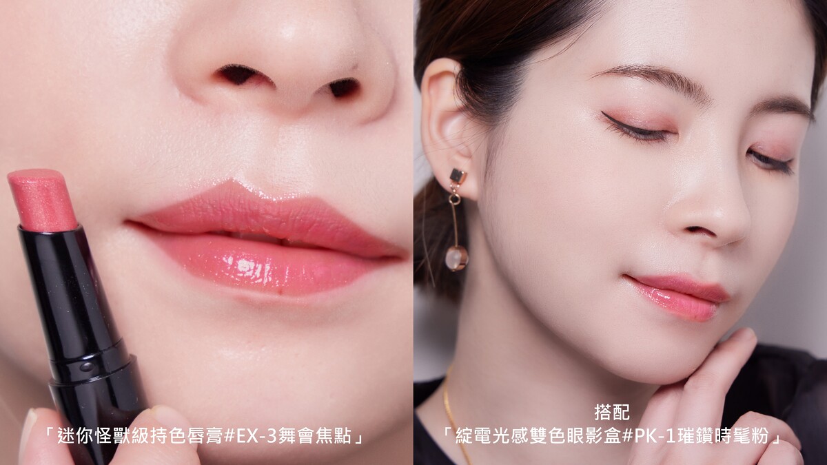 帶有珠光的「迷你怪獸級持色唇膏」最適合搭配「綻電光感雙色眼影盒」一起用,描繪出濕潤光澤的水光透明感,不只好感度滿分,還能輕鬆打造出日常閃耀粧感,讓2022天天都是目耀日!