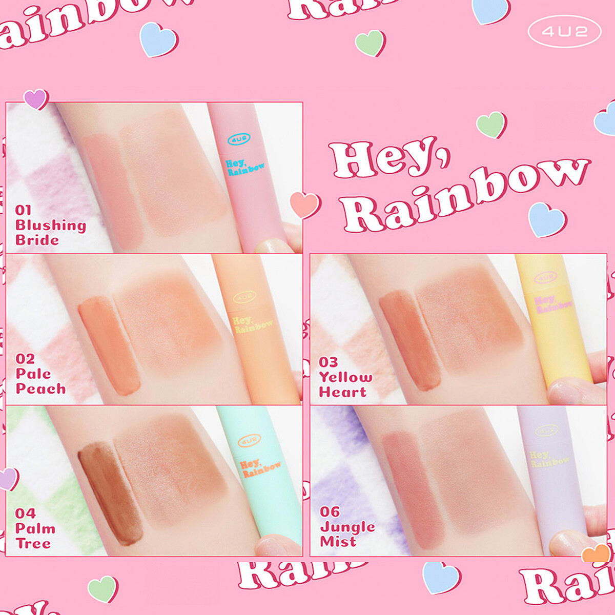 泰國彩妝品牌4U2今年夏天正式回歸,以情人節為靈感發想,推出HEY, RAINBOW彩虹調色渲染腮紅液。延續了品牌一直以來的特色,外裝使用了霧面低飽和的夢幻彩紅色調,液態質地只要刷頭輕輕一刷,用手輕拍就能暈染。