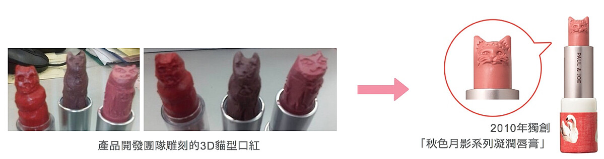 PAUL & JOE推出的立體貓咪唇膏讓人大為驚艷,其實這項產品當初在開發時,因為從未有人做過,所以開發團隊很難與配合單位說明什麼是3D立體貓形唇膏。產品開發團隊只好自己用雕刻刀先把唇膏刻畫出立體貓咪形狀來展示,後來才得以在2010年秋季首次推出全世界第一支立體貓咪口紅-秋色月影系列凝潤唇膏LIPSTICK C。