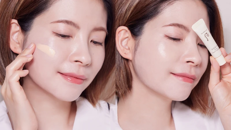 除了用「拱辰享雪白提亮防曬水氣墊」拍出高光肌外,組合內的「拱辰享絲絨柔霧粉底液」一抹貼合、彷彿為肌膚披上絲絨柔紗,完美修飾毛孔與瑕疵,底妝平滑且帶點微光澤,打造細緻優雅的妝容。