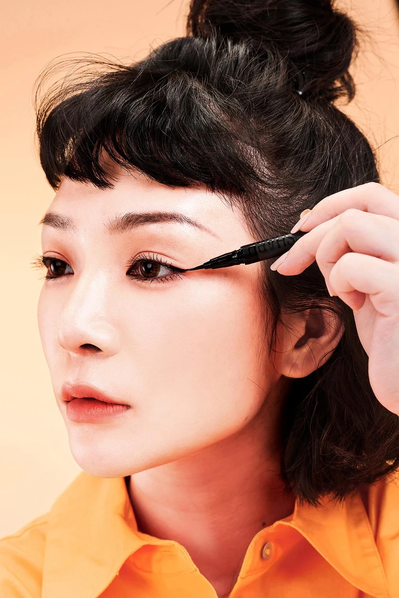 先用「36H極限持久激細抗暈眼線液」極致黑沿著睫毛根部描繪眼線,到 眼尾時請大膽順著眼型往上拉長1公分左右,這樣一來眼型不會變鳳眼,眼線也超有氣場,接著同樣往回拉,氣勢強到炸,時髦個性女孩可以加強眼頭線條,有開眼頭效果,打造贏家眼線,最後別忘了畫上宛若真眉柔霧塑型眉膠筆勾勒俐落卻自然的絲霧眉,妳說風就是雨沒問題!