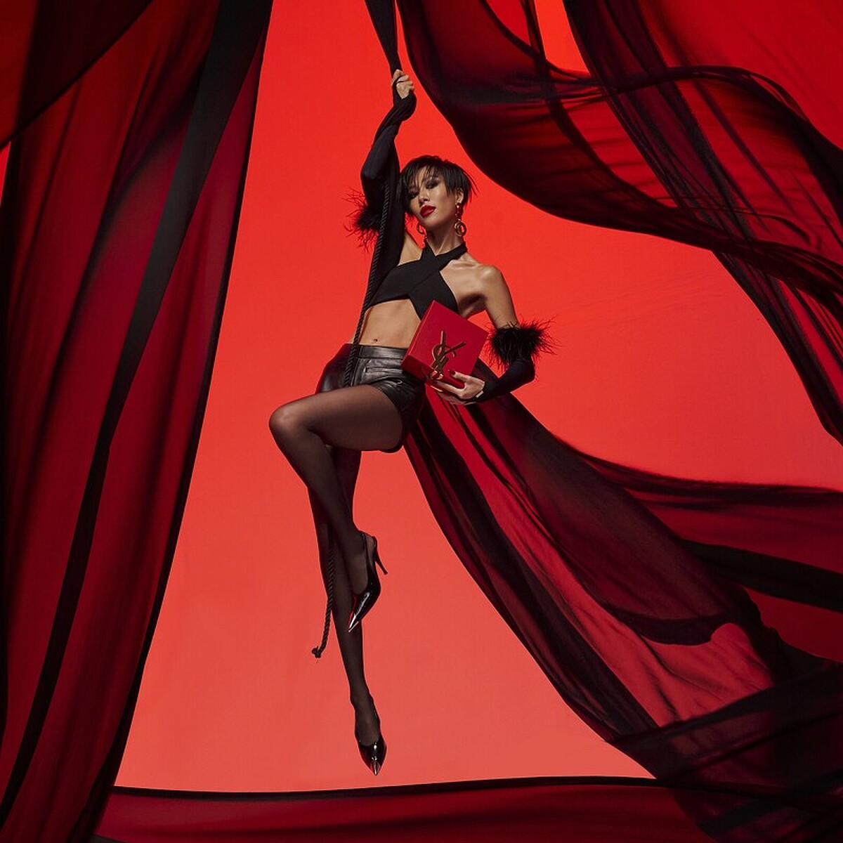 莫莉,化身性感的形象,手拿烈焰紅色皮革禮盒,自由又性感的率性模樣,激起每個人心中的收藏慾望,想跟著莫莉一起用YSL辣美一波!