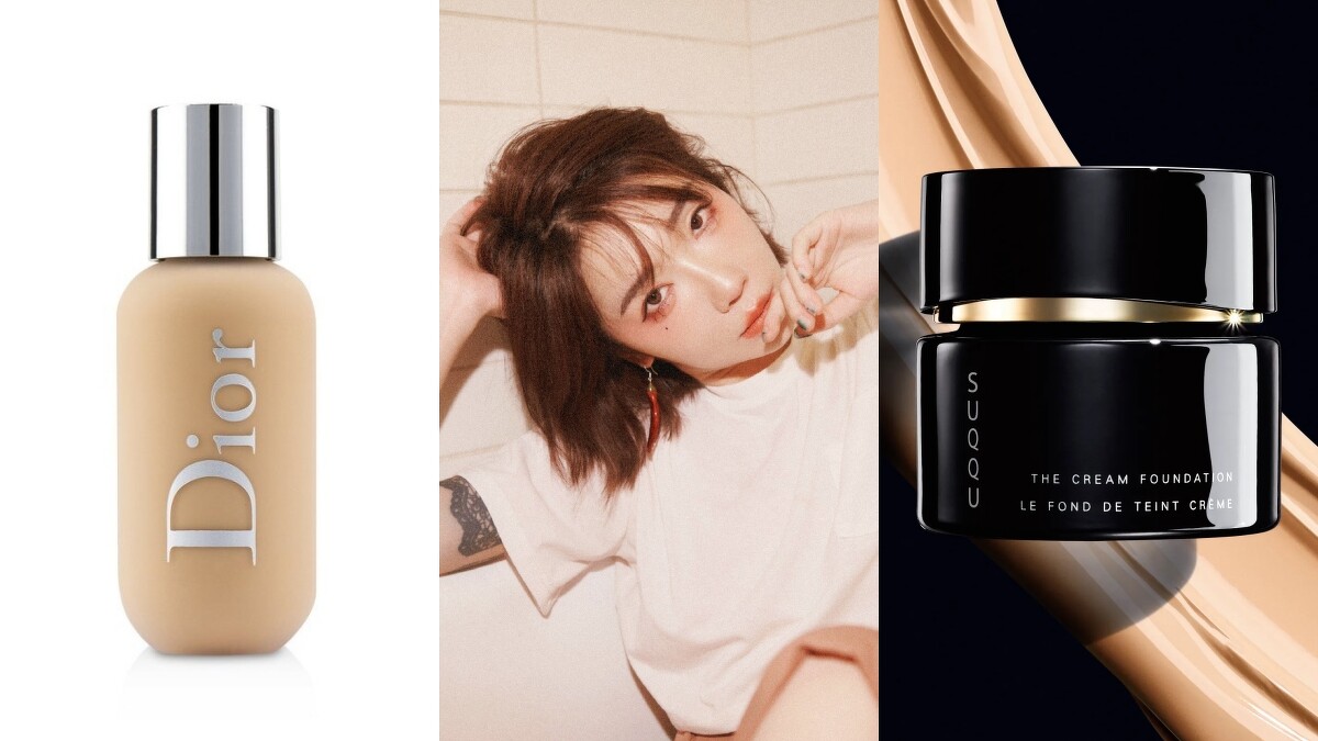 彩妝師表示會看狀況選擇Dior 專業後台雙用水粉底或是SUQQU粉霜,雙用水粉底主打輕薄但持久,很適合夏天使用;粉霜則是適合想要妝效更加無瑕的時候登場。