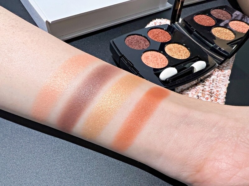 香奈兒四色眼影2022年推出超美限量系列,以品牌經典布料「斜紋軟呢」為靈感,讓斜紋軟呢幻化為浮雕圖騰眼影盤多了精緻織紋,色彩上也超實搭,而且連外面的收納袋都是斜紋軟呢!