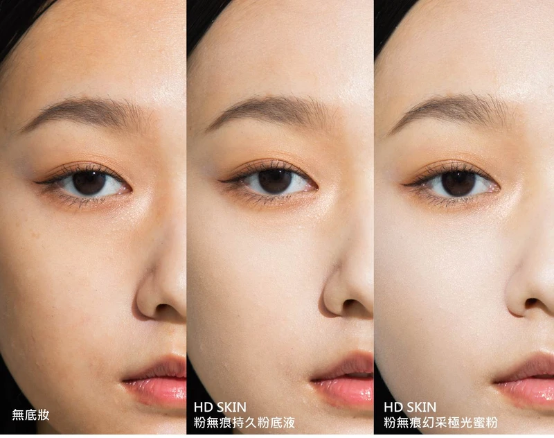 馬上就來讓大家眼見為憑!M編邀請彩妝師來現場示範,1+1完妝效果全場工作人員都視之為神!神奇地把蠟黃肌翻轉成仙女美肌,簡直偽素顏天菜啊~可以看到Model原本肌膚偏暗黃,還有粉刺、斑點等膚色不均問題,上了第一層MAKE UP FOR EVER《HD SKIN粉無痕持久粉底液》,膚色已經透亮白皙大升級,斑點小瑕疵全隱形!再上第二層「轉轉蜜粉」《HD SKIN粉無痕幻采極光蜜粉》之後,剔透質感更明顯,真的像自帶Spotlight,細膩、透光、白皙無瑕!