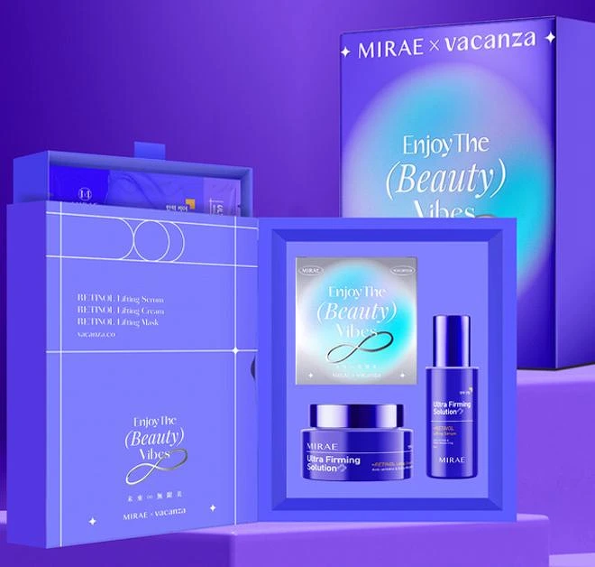MIRAE未來美首次跨界與 vacanza飾品聯名推出「未來∞無限美 禮盒」,包含超級A醇繃繃精華30ml、超級A醇繃繃霜50ml、超級A醇繃繃面膜5片、「祈願™ 未來∞無限美」純銀手鍊,以A醇系列融合韓國專利提拉胜肽、95%高純度積雪草苷,有感改善暗沉、毛孔、粉刺、初老、細紋5大肌膚問題。