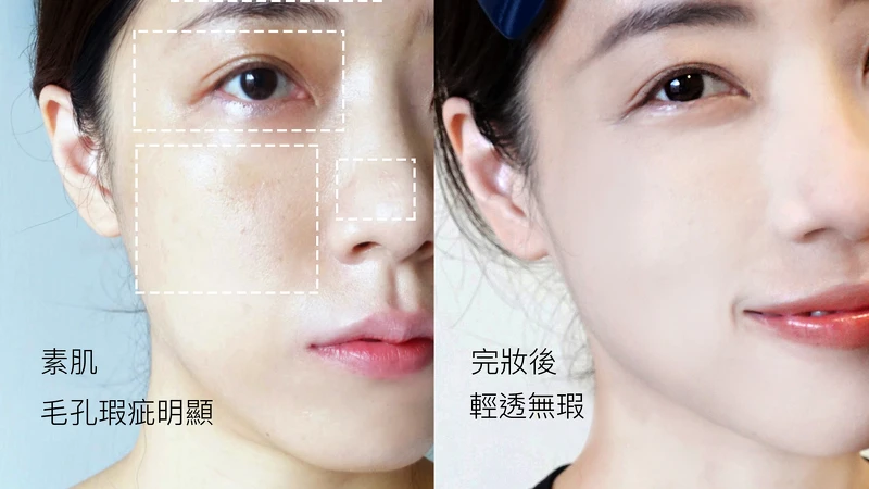 一開始就直接奉上素肌和完妝後(美到燦笑)的膚質差異對比照,這種仙女等級的透亮無瑕絕對會讓人以為是套過美肌濾鏡的膚質,一定要先分享!