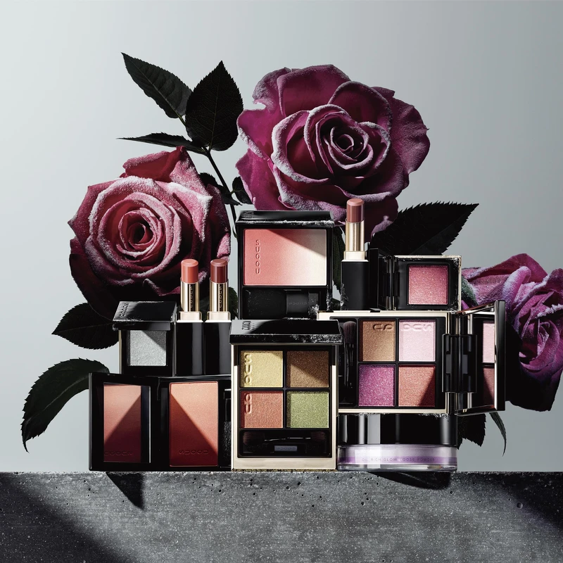 比起春夏盛開的繽紛玫瑰,冬日綻放的冬薔薇帶有些許的孤寂氛圍。今年SUQQU以冬薔薇帶暗感的花瓣與綠葉、包裹著植物的經營雪花為靈感打造系列彩妝,以細膩色彩的堆疊詮釋飄蕩在寒冬中的花朵也能燦爛且溫暖。