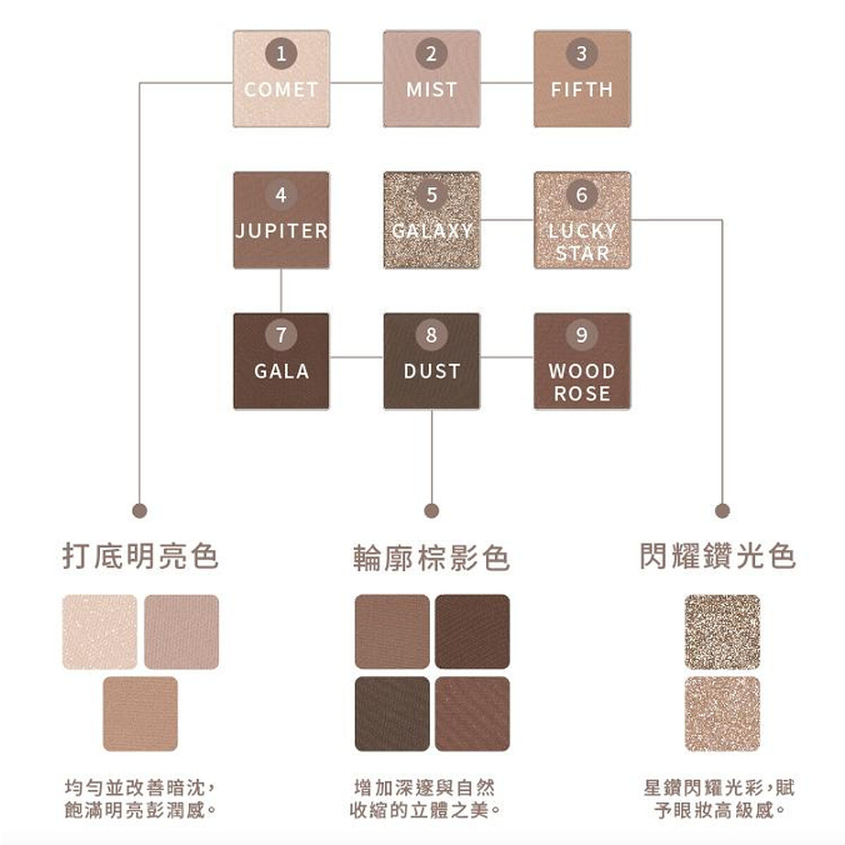 9色色選包含溫柔低調的伯爵奶茶和可可裸色,及不同層次的棕色調如玫瑰棕、特調襯膚橘棕及榛果暖棕等,整盤眼影任選搭配都不會出錯,可以隨心所欲調配出不同濃度和質感的妝容。