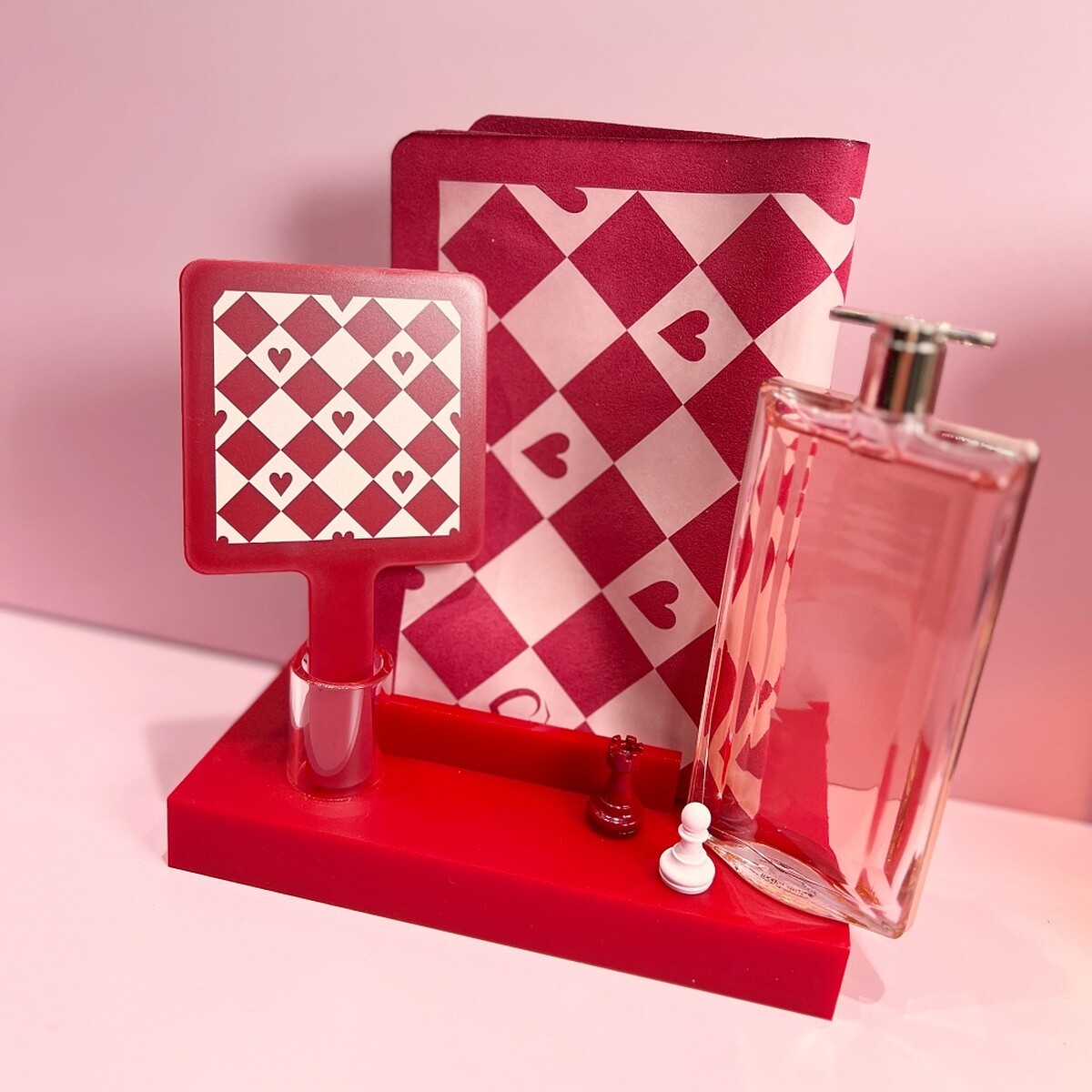 期間至全台蘭蔻專櫃或官網消費且含IDÔLE唯我香水50ml以上,即贈限量消費禮「愛戀棋盤格化妝墊」、「愛戀棋盤格手拿鏡」。手拿鏡超可愛嫩粉色、深紅色相間的棋盤格設計,搭配化妝墊的麂皮材質,為日常生活點綴浪漫儀式感。