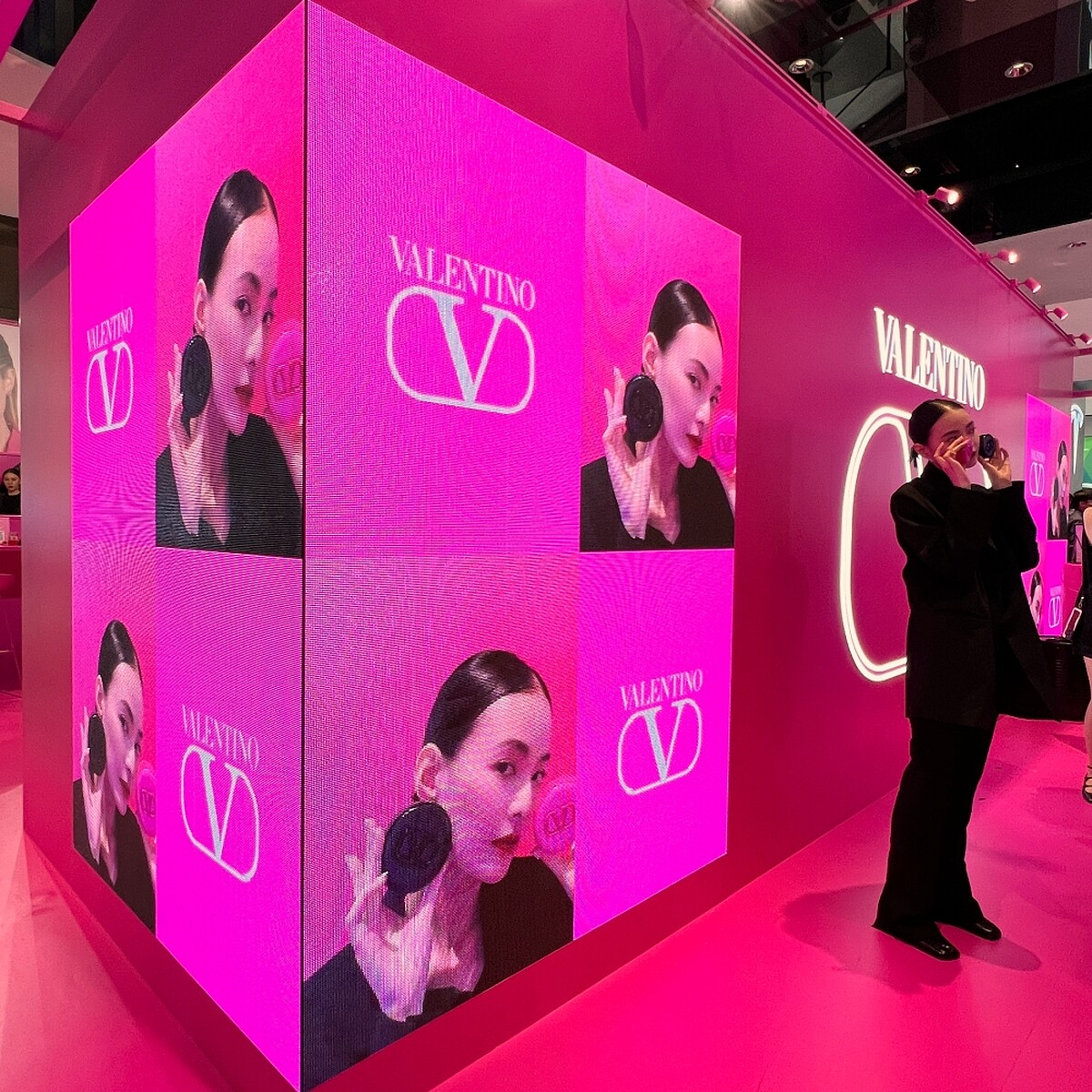 在Valentino經典大V Logo前自由展現時尚態度,動態影像即時同步投放至兩旁螢幕,並自帶PINK PP專屬COLOR YOUR REALITY濾鏡,如同高訂伸展台般的焦點,盡情揭示我潮、我酷、我高調的Valentino Beauty核心魅力。