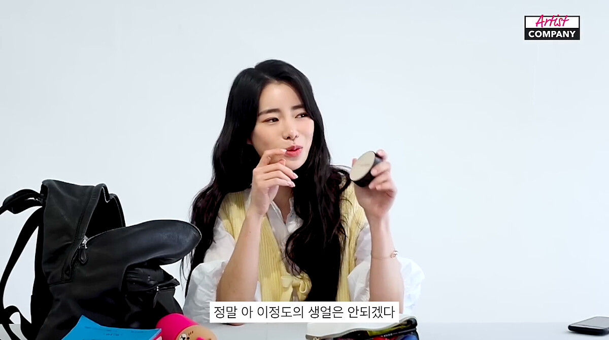 化妝包裡林智妍放了兩顆氣墊,笑說因為自己平常並沒有很會化妝(拍攝都有化妝師),如果自己出門的時候覺得自己臉太素了,就會使用氣墊+眉筆完成基本的妝容。