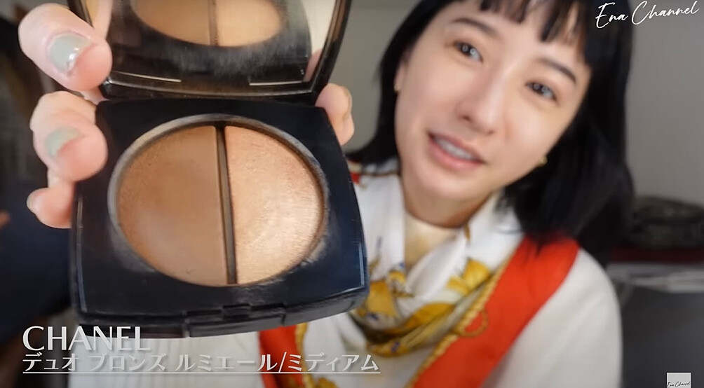 使用CHANEL雙色修容餅稍微修飾臉頰和下巴,帶有鑽石光澤感的提亮膏加強在顴骨和山根處。