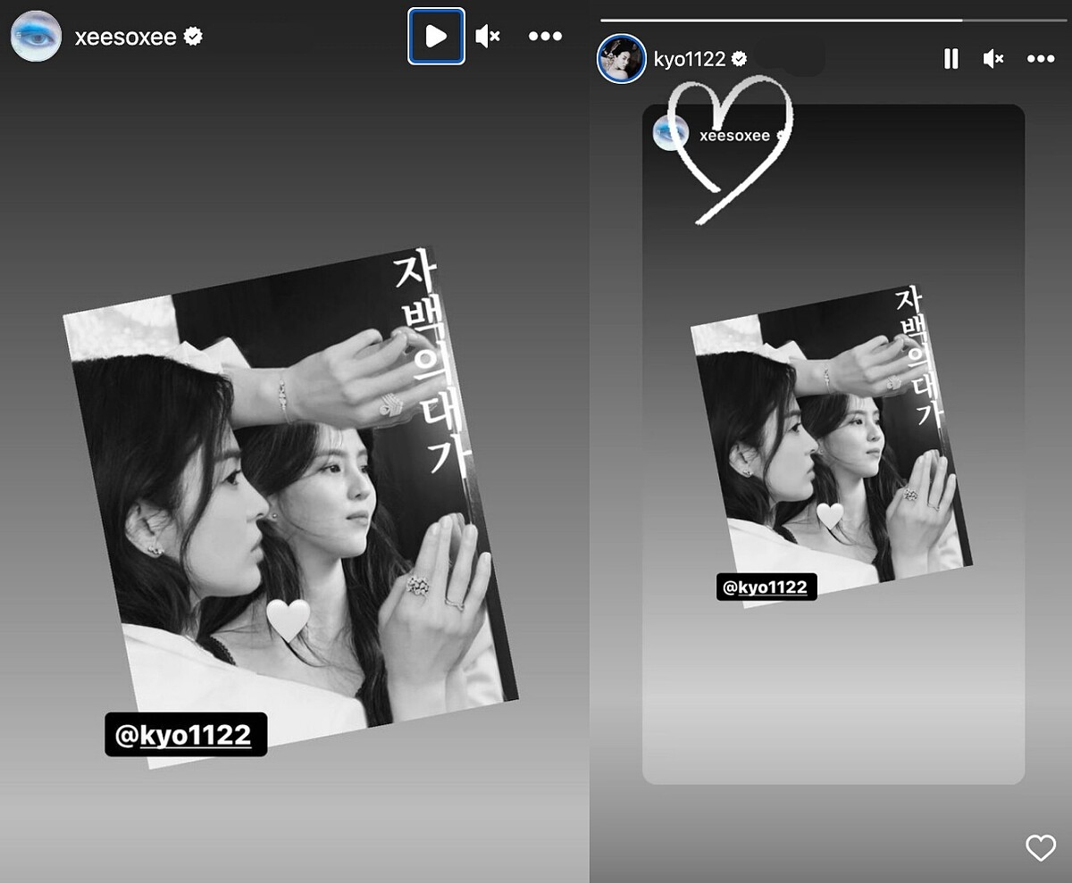 其實韓韶禧原本就是宋慧喬的粉絲,韓韶禧更在自己的Instagram動態上貼出與宋慧喬的合成照,宋慧喬也轉發並畫上愛心,更有眼尖網友發現韓韶禧在宋慧喬關於《黑暗榮耀》花絮照的貼文下留言「現在你是我的了⋯」,希望未來還有機會看到宋慧喬和韓韶禧合作。