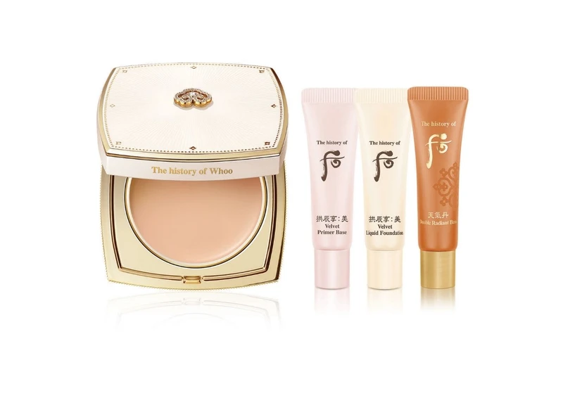 Whoo后「拱辰享絲絨柔霧水粉餅」的粉體添加了當家「拱辰精萃」(由高效人蔘萃取、鹿茸、山茱萸、當歸等組成的複合保養成分),對於穩定膚況、幫助肌膚油水平衡、提昇肌膚彈性與防禦力都有出色效果,能讓肌膚愈上妝愈緊緻透亮、充滿活力。此外,「生機五花津」及「紅玉白散」兩大保養秘帖,則可水潤保濕並細緻肌理,同時提升好氣色;奢華的宮廷寶石──珍珠、黃金、琥珀,更是增添光澤、平滑肌膚、修飾毛孔的珍貴美肌奧秘。