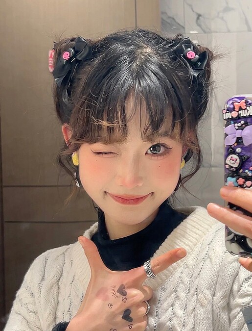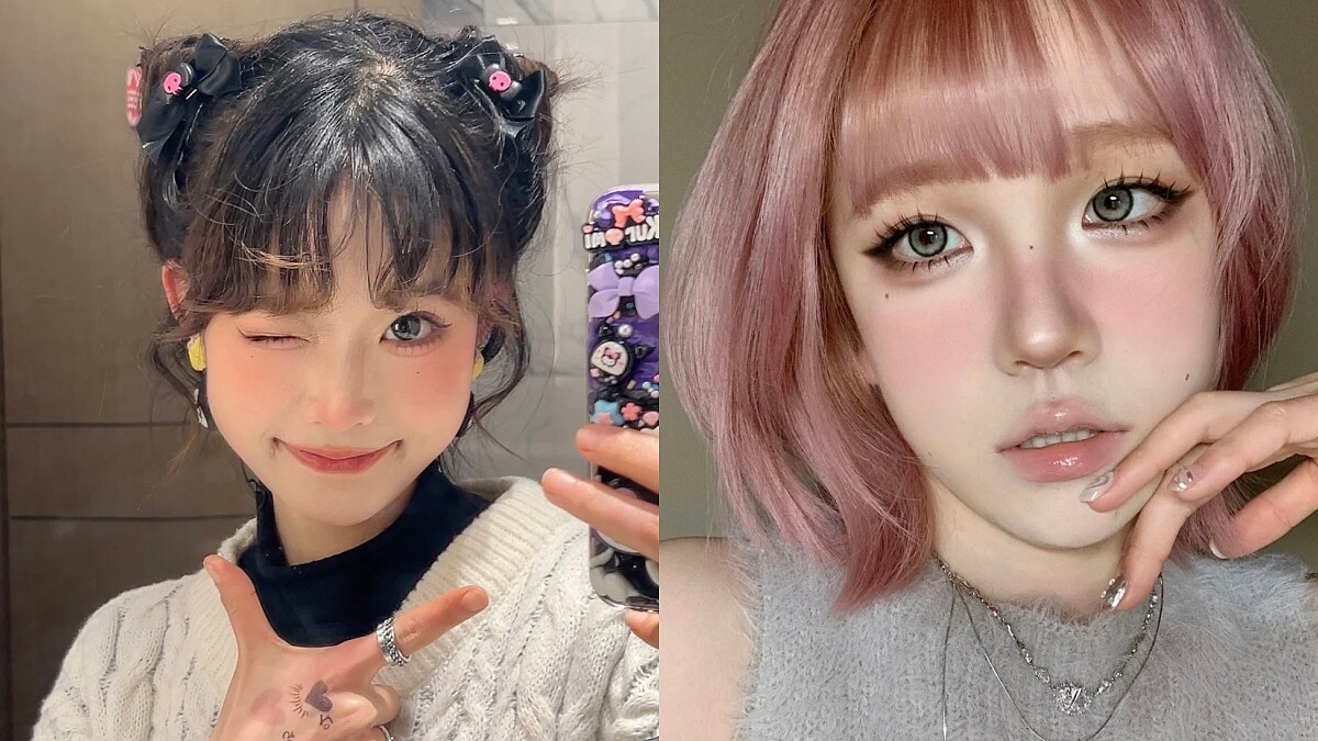 有瀏海的黑直髮、公主切或雙馬尾最能代表,雙馬尾的髮飾可以選擇緞帶更有氛圍感!清爽版夏日酷洛米眼妝,把煙燻感眼影部分捨去,直接以粉紫色搭配珠光感亮粉完成眼妝,加強睫毛捲翹感,或是選擇紅棕色眼線筆勾勒眼線加強特色,最後貼上一些可愛小貼紙增加氛圍感!
