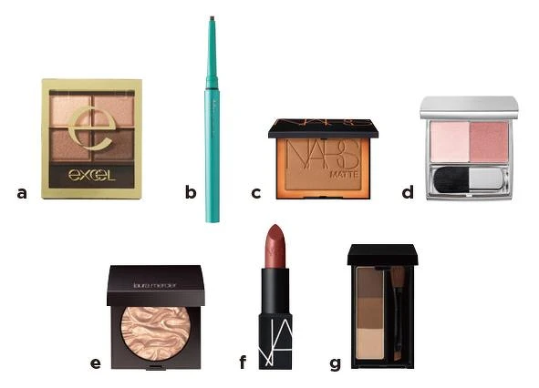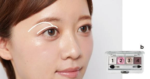 用a的眼影在眼尾做層次,在眼摺加入細細的收尾色。用b的眼線在眼尾畫微上揚的眼線,呈現鮮明印象。圓圓的眼睛因直線而隱藏了稚氣。