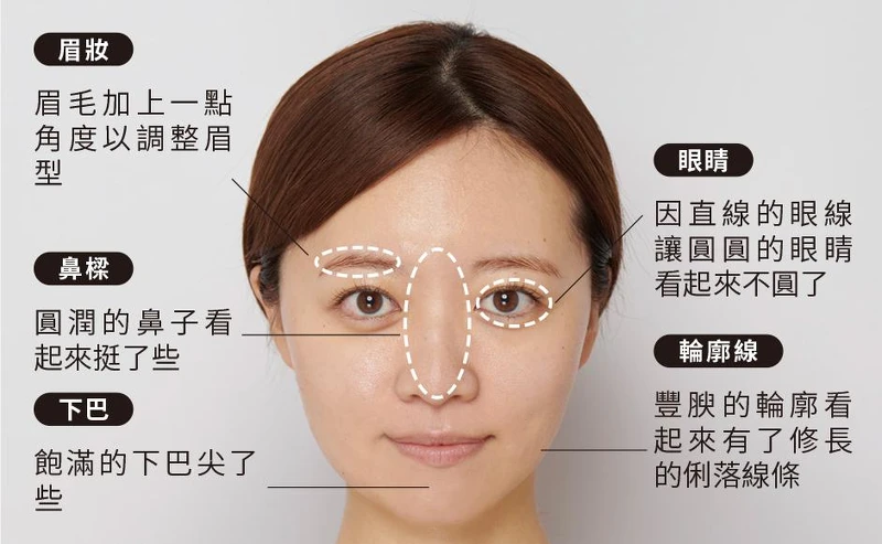 用陰影、打亮使下巴和輪廓線看起來有了修長的纖細感,完全轉變為成熟大人臉。眉毛也因有角度的美人眉使得整個臉龐更緊緻,呈現洗鍊氛圍。