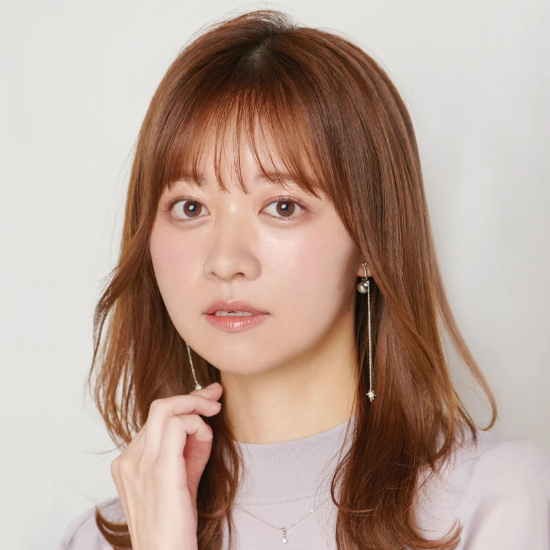 活用給人溫柔印象的圓臉,藉由光澤感及透明感的底妝,提高好感度。眼線不特別加長,用眼影和睫毛膏成現眼睛的縱長,圓潤大眼即完成。