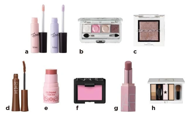 先用f臉頰中間畫圓,接著再重疊e,給人可愛印象。用g的光澤系粉紅色口紅增添淡淡的夢幻感。