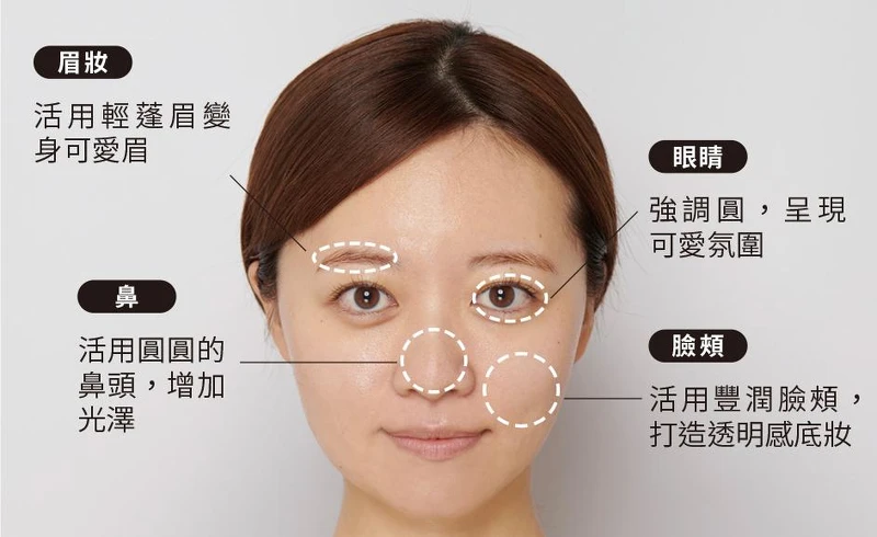 重要的是要百分百認識自己的臉型特徵、發現適合自己的妝容,與其總是在意自己五官的弱點,不妨活用這些特色畫出自然又可愛的樣子。如果是圓臉,就活用「圓」的部位,呈現夢幻又可愛的魅力,如此一來,讓化妝的類型變得多元,也能在每一次流行彩妝上找出專屬自己的魅力!