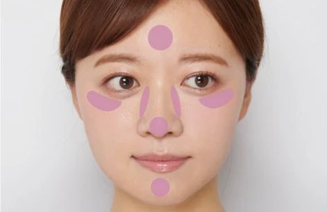 用h畫在顴骨和眼頭下方以呈現光澤感。接著在額頭、鼻頭、鼻子兩旁、下巴加入珍珠系打亮粉,呈現高雅氣質。