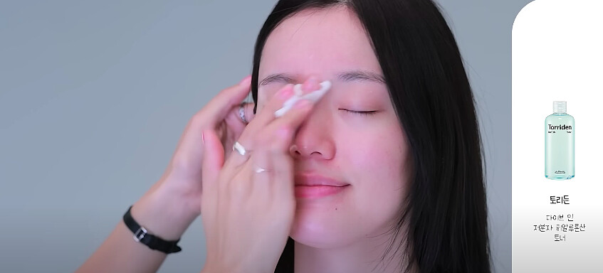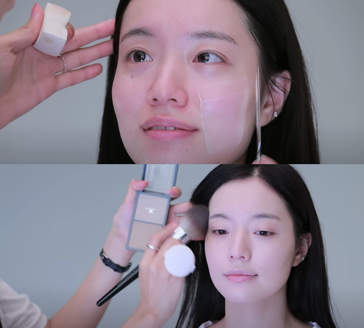步驟三:因為舒華的皮膚非常白皙,選擇偏粉的明亮粉底液,少量多次疊擦。Haemin老師提到如果妳是容易泛紅、有瑕疵的皮膚,可以先用妝前乳搭配輕透感的粉底打底,再選擇一個遮瑕力較好的粉底液輕輕壓一層,讓妝感看起來更加輕透無瑕!
