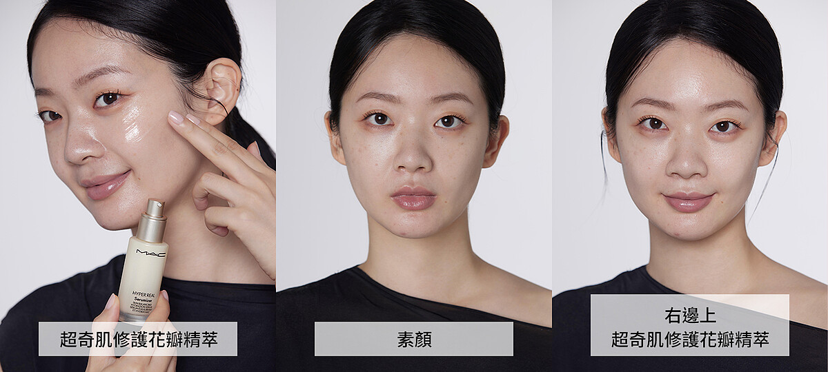 想要妝感完美、持妝性高,妝前就要好好打造肌膚的水潤度。M·A·C彩妝師一致推薦最清爽保水的「超奇肌修護花瓣精萃」,精華質地上臉一抹化成水感,超好吸收膚感也特別舒適,內含日本白芍萃取、菸鹼醯胺、神經醯胺以及玻尿酸,可以立即幫肌膚迅速補水保濕。長期持續用下來還能細緻毛孔,讓肌膚達到油水平衡,更能幫助後續妝感服貼不脫妝。
