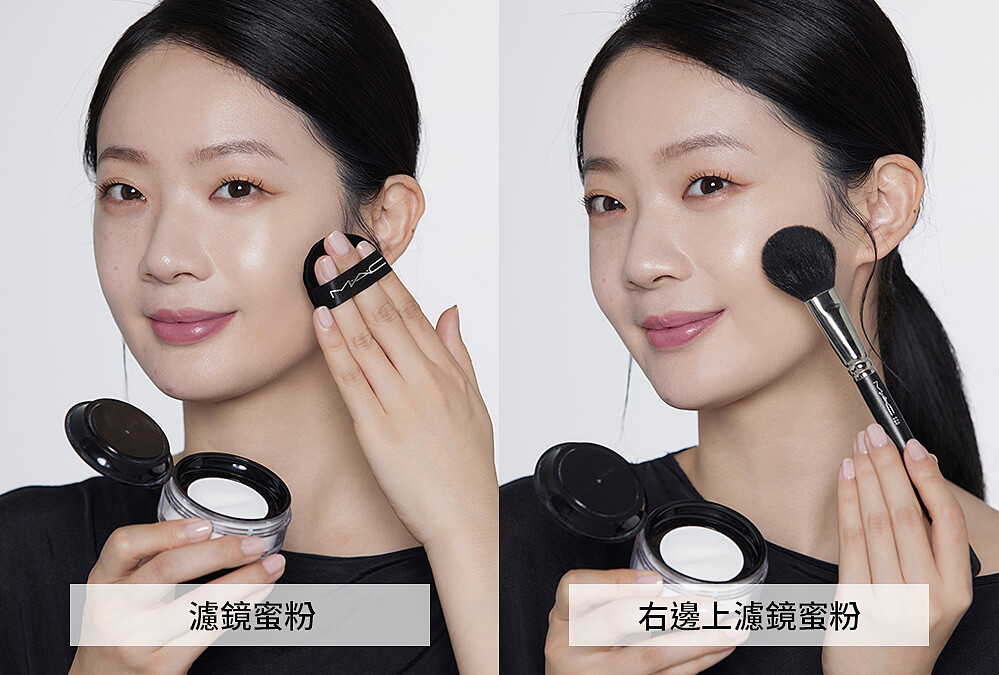 打破水潤絲緞肌無法用蜜粉定妝的疑慮,M·A·C活動彩妝師認為其實局部定妝,更可讓蘋果肌上立體受光面的光澤更加耀眼!只要用小型蜜粉刷取適量濾鏡蜜粉,輕刷在容易出油的部位以及動態紋處即可,保留蘋果肌上用#聚光粉底打造的絲緞光感,這樣一來就就算不刻意修容也能完成精緻立體顏。