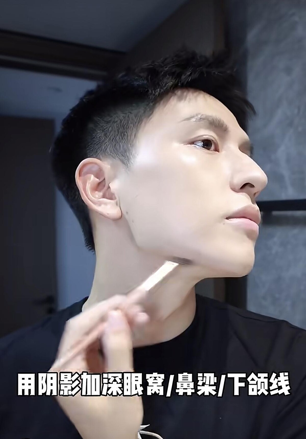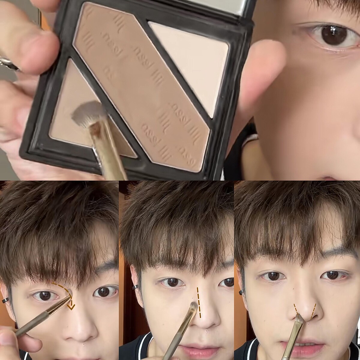 利用修容產品來突顯輪廓,例如在眉骨、顴骨、眼窩和鼻子位置輕輕修飾,讓臉部線條更加分明、成為有骨感的型男。